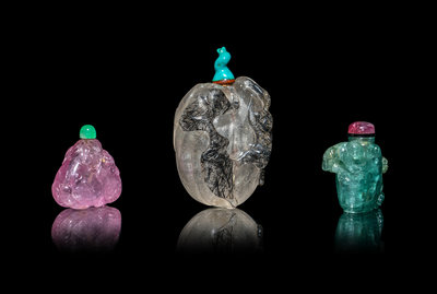 comprising a pink tourmaline 'fu lion' example, green glass stopper; an aquamarine 'boys' example, pink tourmaline stopper; and a hair crystal 'melon' example, turquoise glazed stopper.