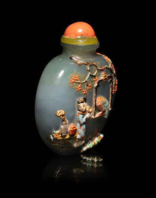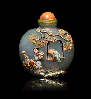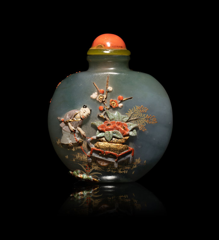 the jade bottle embellished with lacquer and soapstone by the Tsuda Family in Kyoto during the early 20th Century and depicting a young lady with precious antiques and a parrot on one side, a young boy with a detailed floral basket on the other, red coral stopper.