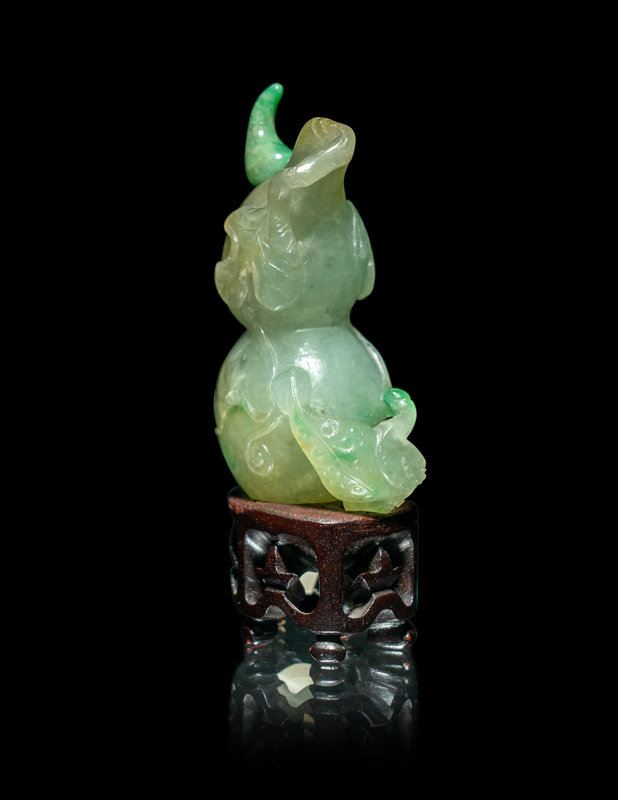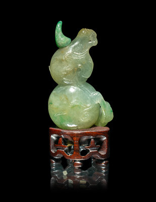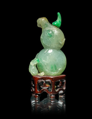 carved in the shape of a large gourd with a bat resting atop, together with a hardwood stand, green jadeite stopper.