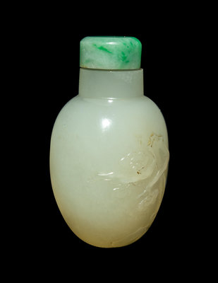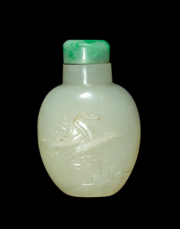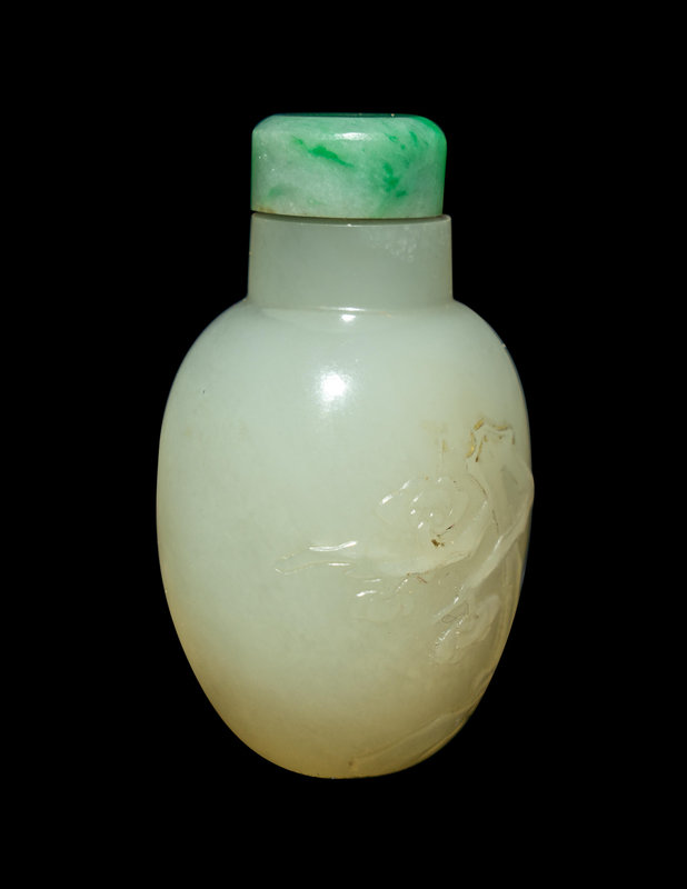 of compressed ovoid form with a straight neck, the milky stone carved in soft relief with a craning begonia tree, jadeite stopper.