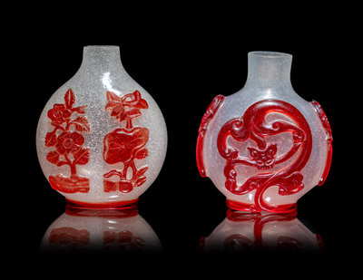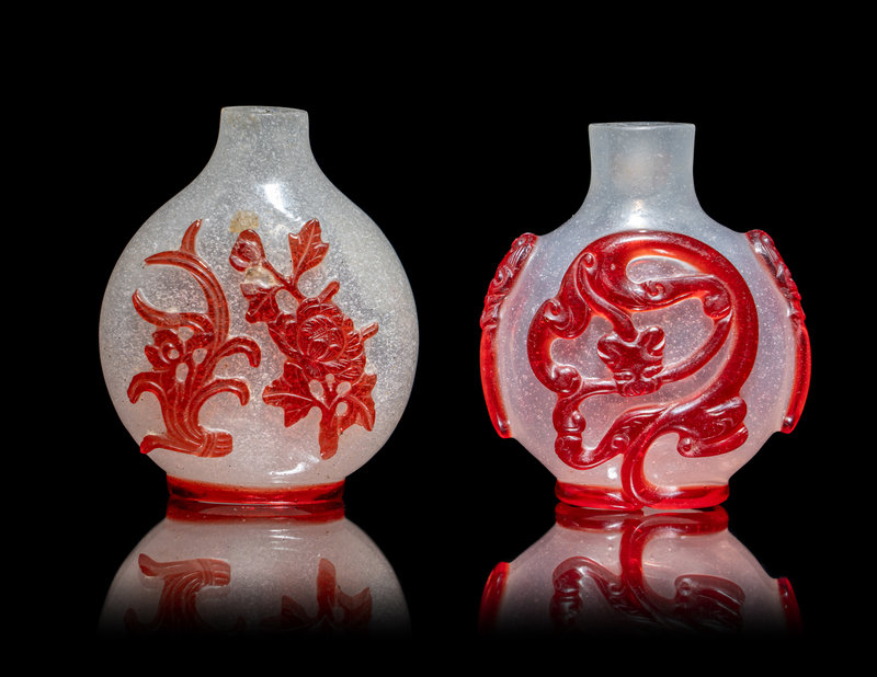 the first example of the full pear form body resting on an oval footring, applied onto the snowflake ground with a thin layer of red overlay, carved to depict seasonal flowers such as an orchid, chrysanthemum, peony, and lotus. The second example of the semi-translucent body overlaid with a coiled chi dragon on each side, their tails forming the footrim, adorned with a mock mask on each shoulder.