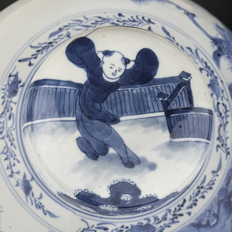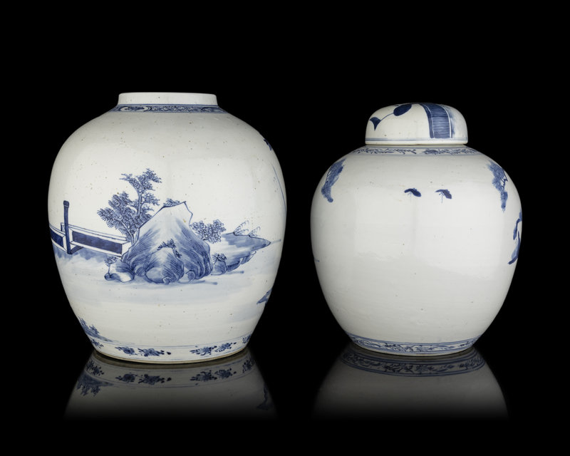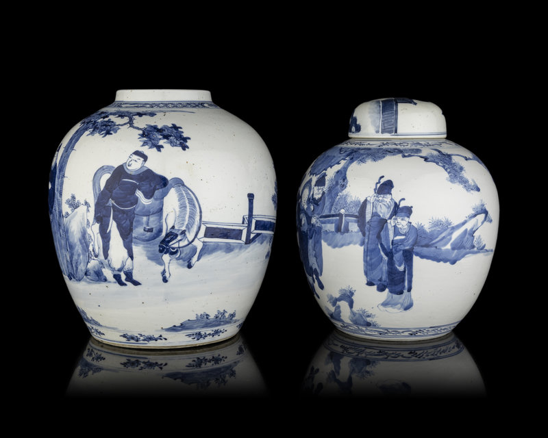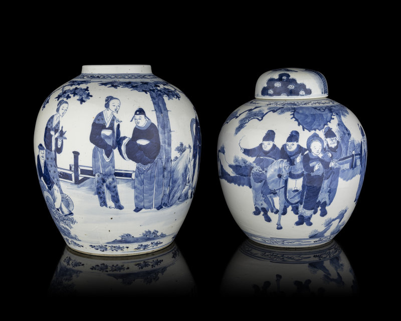 each of ovoid form, the larger jar decorated with a couple and their attendants in a fenced garden; the smaller jar painted with soldiers conversing to an elderly couple, the domed cover decorated with a boy on a terrace, the underside bearing an apocryphal Kangxi four- character mark.