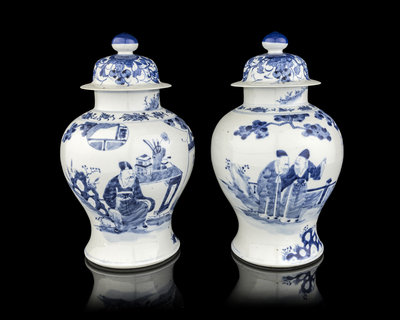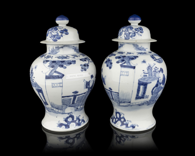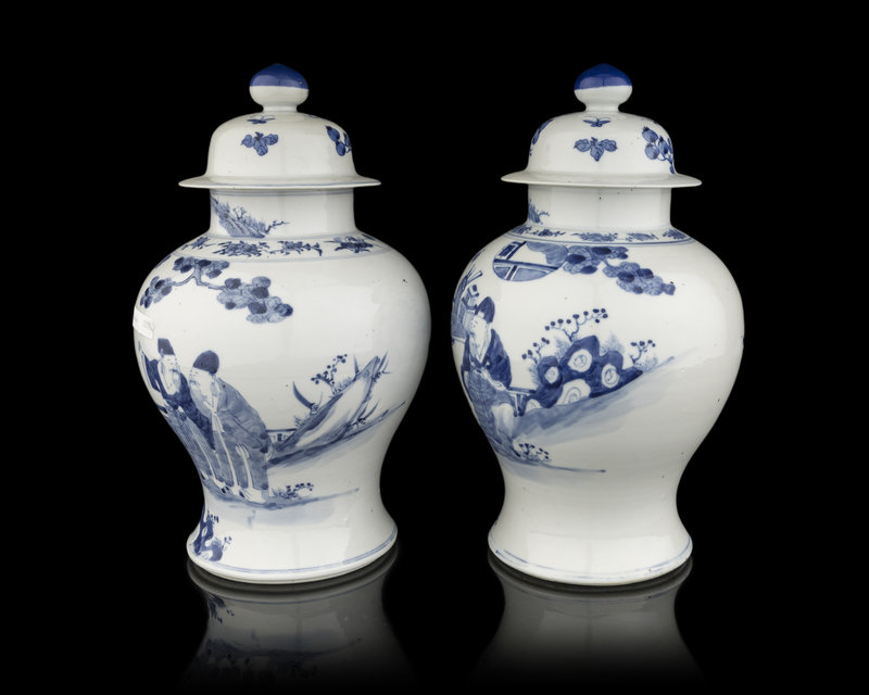 each baluster jar painted to the round, broad shoulders depicting two scholars walking in a garden, entering a house with another scholar seated beside a table with scholar's objects, the domed cover decorated with fruits and surmounted by a knob finial.