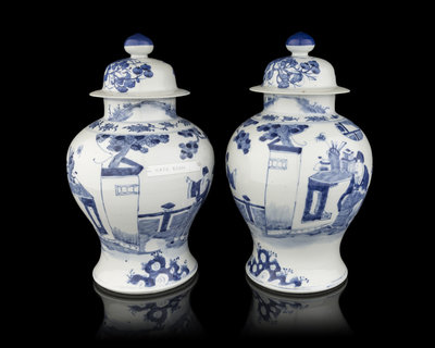 A Pair of Chinese Blue and White Porcelain Covered Jars