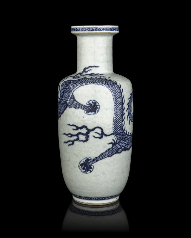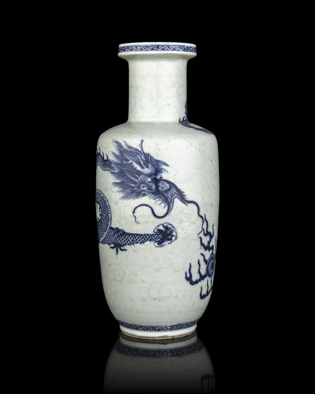 having steep walls rising some a tapered foot to angular shoulders beneath angled shoulders and straight neck. The body defly painted in underglaze blue with a serpentine dragon writhing across a pale celadon ground of incised scallop waves; the underside bearing a double ring to the recessed base.