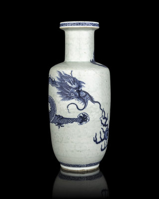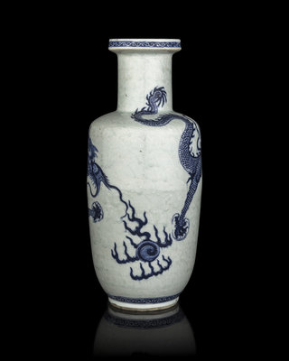 民國 青釉暗刻雲紋地青花龍紋棒槌瓶