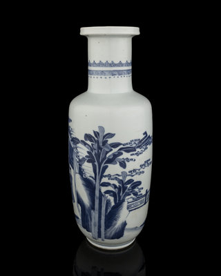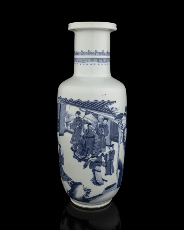 decorated in vibrant blue tones with a continuous scene of figures in a court. The neck is decorated with bands of ruyi heads and keyfrets.