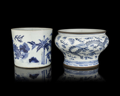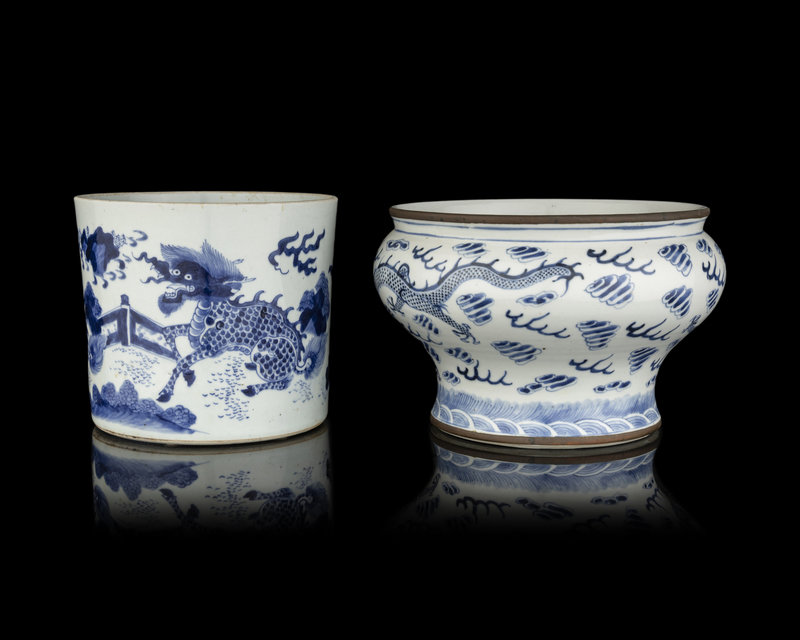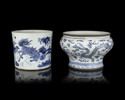 清 青花麒麟筆筒及龍紋缸