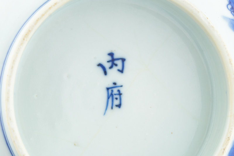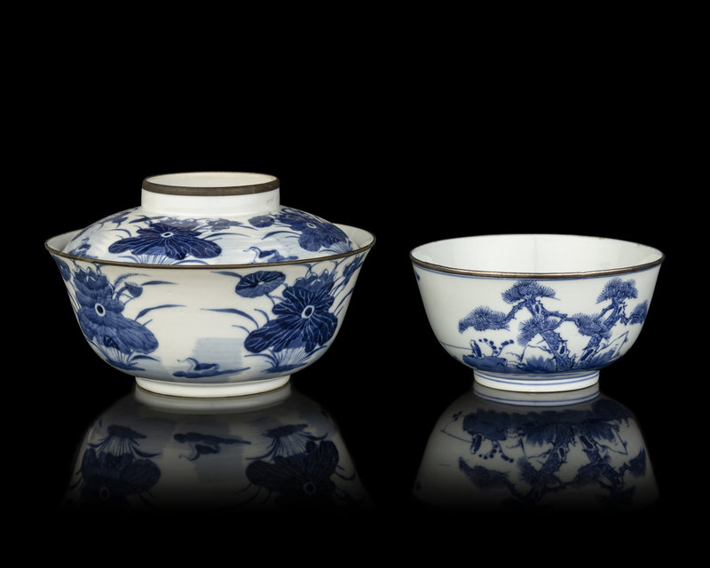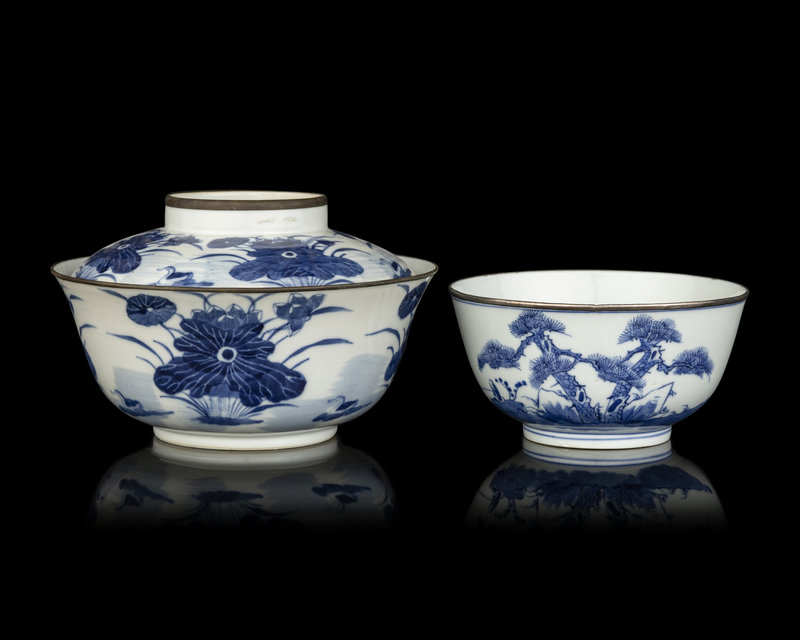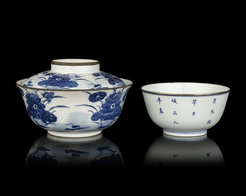 the first bowl with deep, sloping walls resting atop a short foot ring, the mouth rim mounted with silver, the exterior painted with a scholar fishing and seated on a large rock underneath pine trees, the underside bearing a nei fu two-character mark, the second a covered bowl painted with lotus pads and ducks.