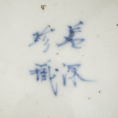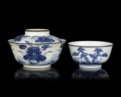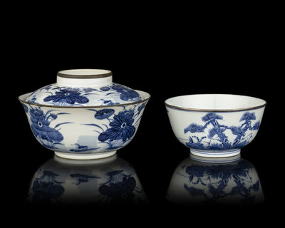 清康熙 青花松石圖碗及蓮塘圖蓋碗