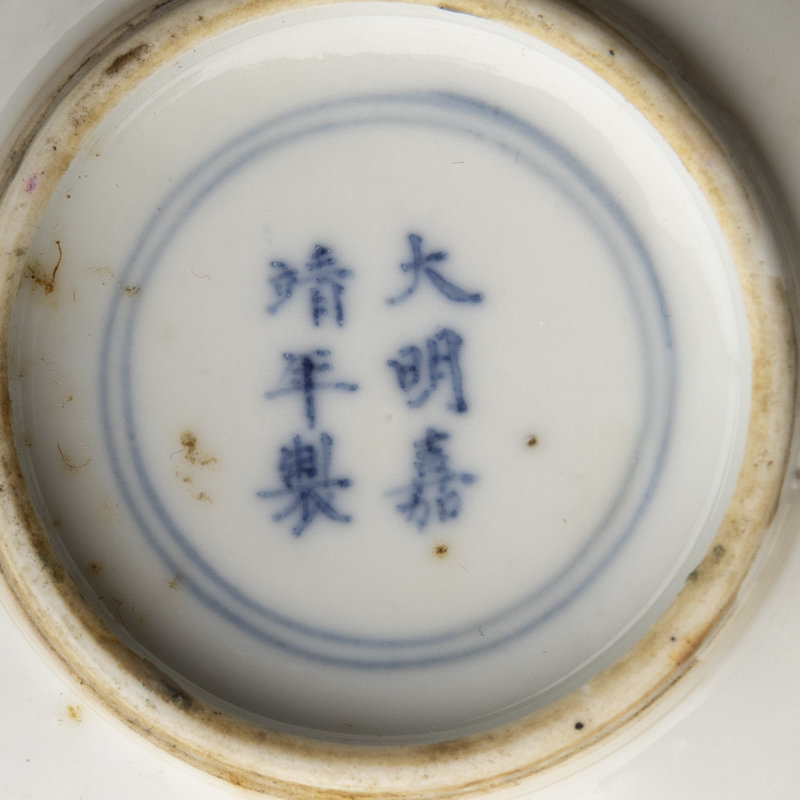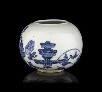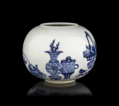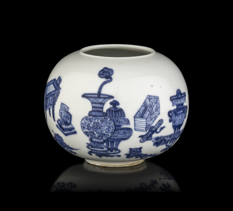 of globular form, the rounded sides rising from a recessed base to a slighted everted rim, decorated in bright underglaze blue with books and bronze vessel motifs, the base inscribed with a six-character Jiajing mark in underglaze blue.
