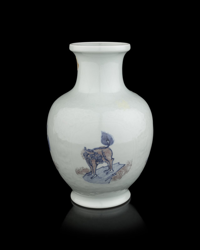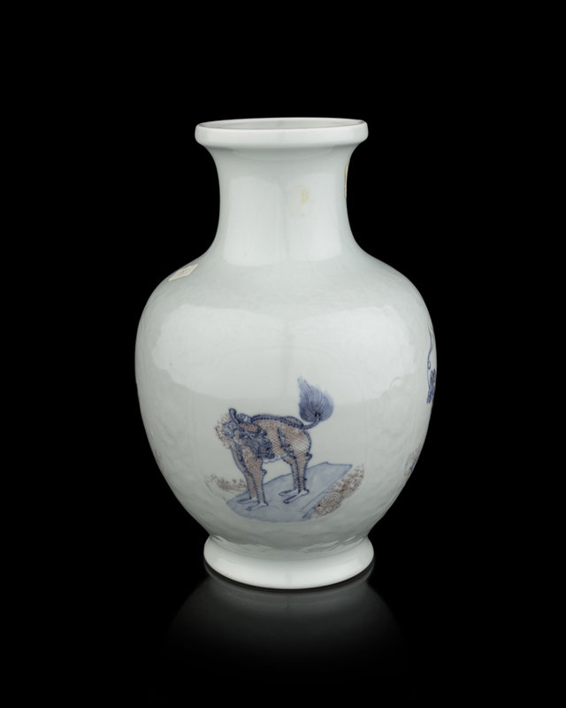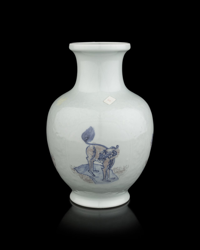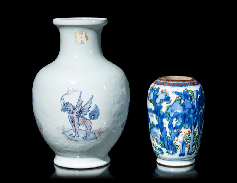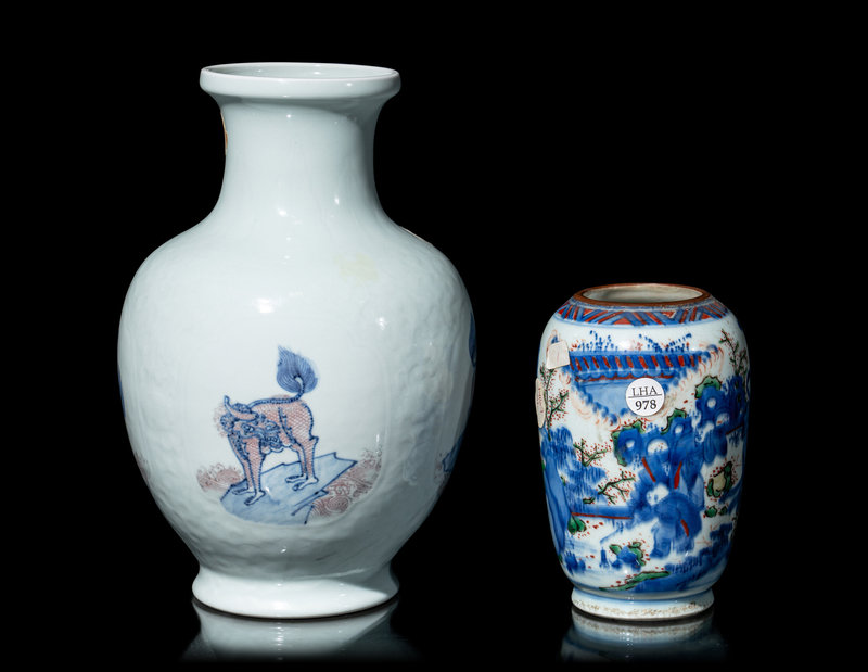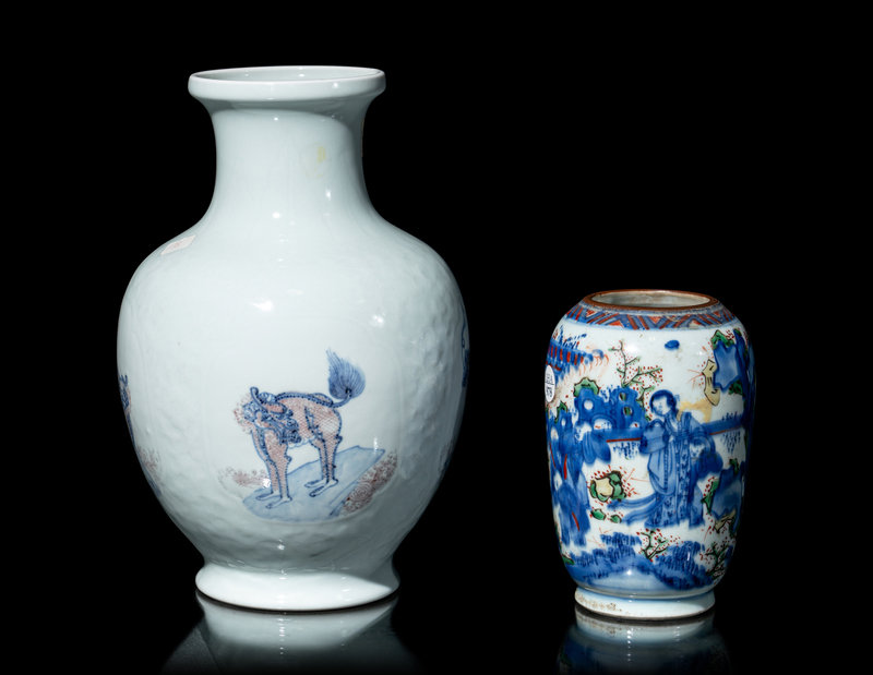 the first a baluster vase, decorated with three qilin figures, the underside bearing an apocryphal Jiajing six-character mark in underglaze blue; the second an ovoid vase painted with figures in a garden.