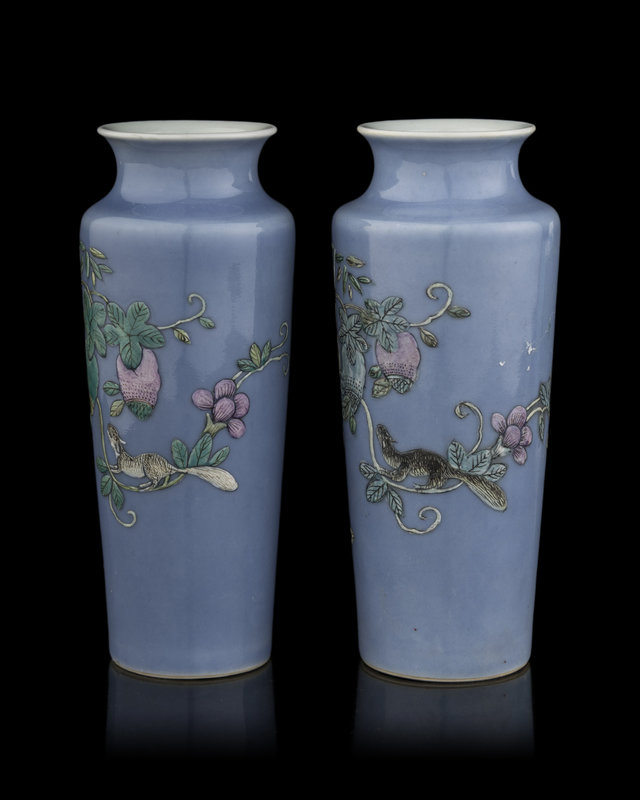清晚期 藍地粉彩松鼠葡萄圖賞瓶一對