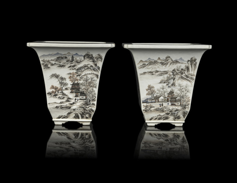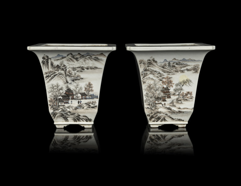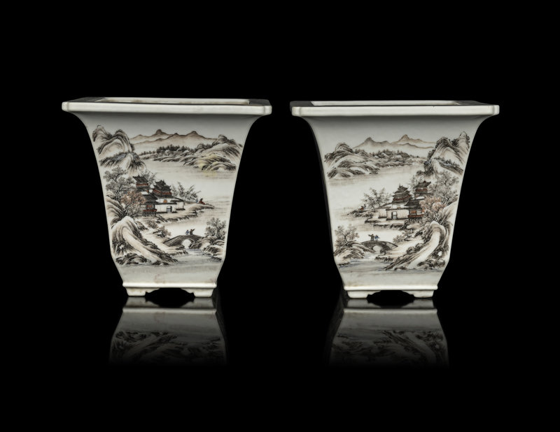 each vessel of square section raised on four bracketed feet and topped with a flared mouth, painted to the exterior showing a continuous landscape of figures, pavilions, mountains and rivers, the underside bearing a blue enameled Qianlong four-character mark within a square panel.
