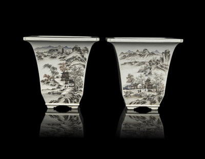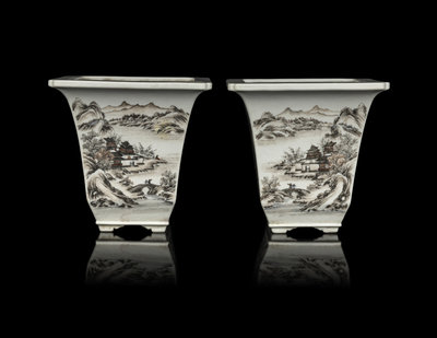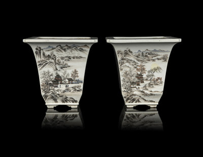 淺絳彩山水圖花盆一對