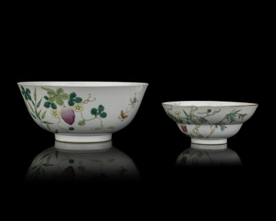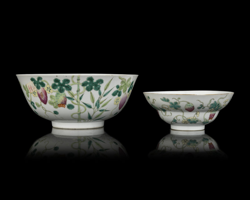 the first bowl having rounded walls above a short, circular foot; the second an ogee bowl; each painted with fruits and melons borne on entwined vines, the underside bearing a Guangxu six-character mark in underglaze blue.