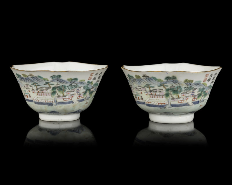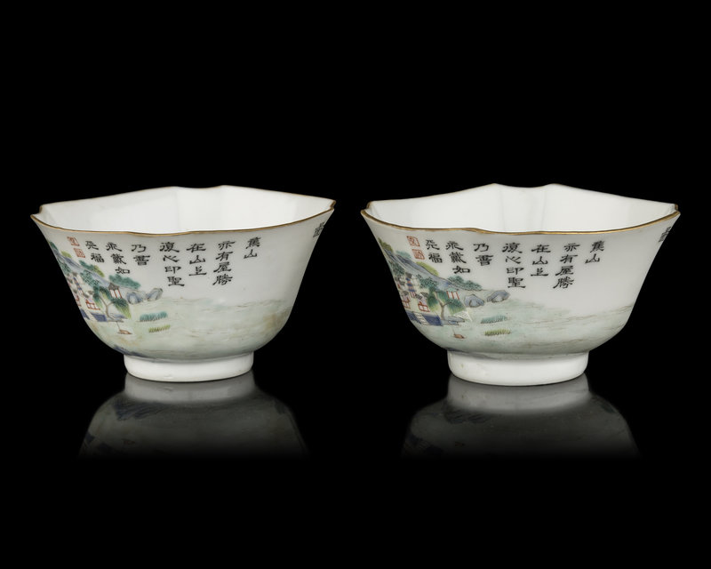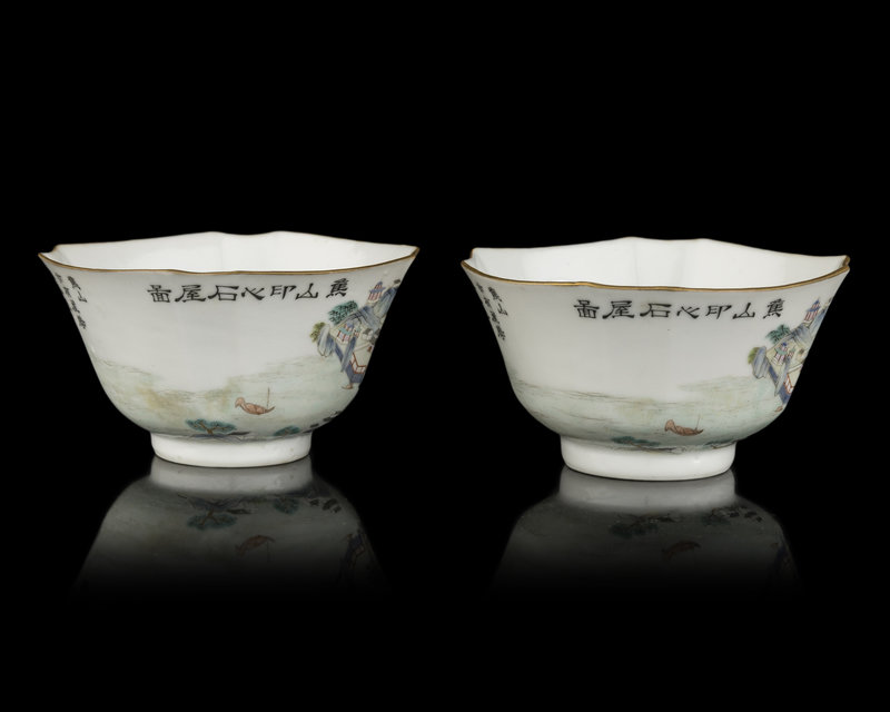 each bowl having sloping walls resting on a short circular foot, rising to a highlighted molded mouth rim, finely painted to the exterior with a continuous riverscape underneath black enameled inscriptions reading 'Jiaoshan yinxin shi wu tu', the underside bearing an iron red Daoguang four-character mark.
