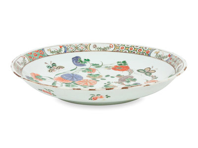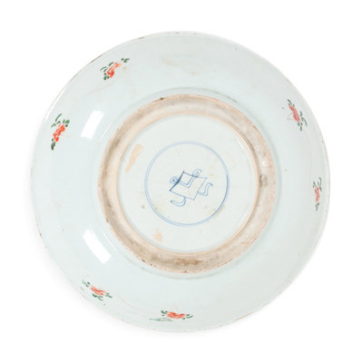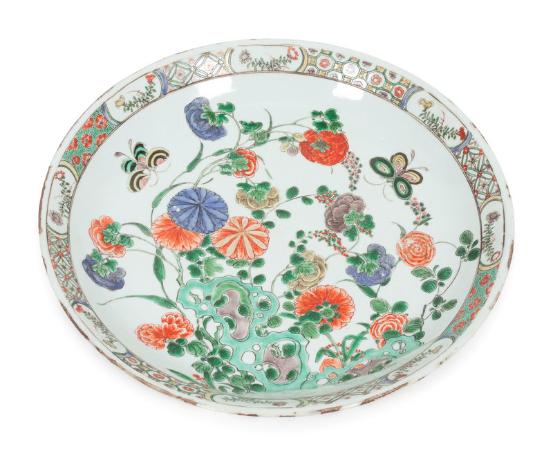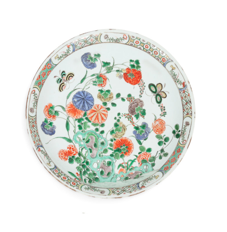 the center painted with two butterflies amongst various flowering plants emerging from rockworks, bordered by flower panels against diaper and cell ground, the underside bearing an underglazed blue auspicious symbol.