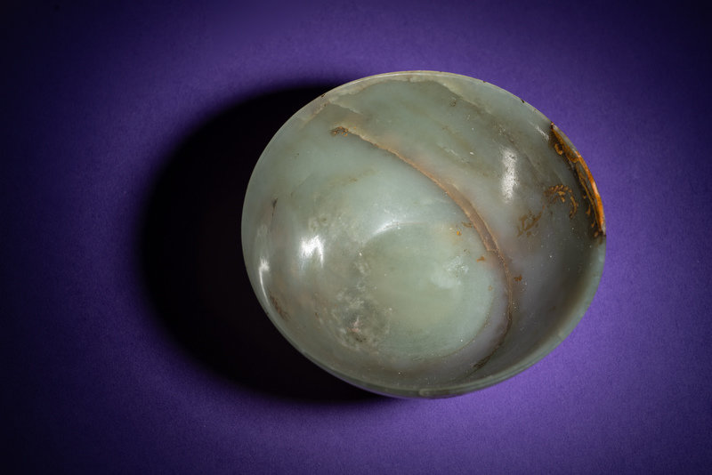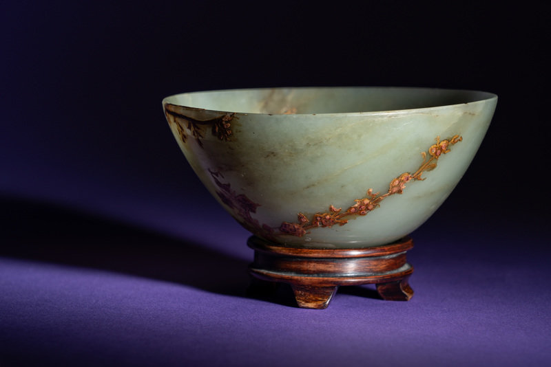 decorated in gilt with a sinuous band of flowers on the exterior, covering the natural russet flecks, the stone softly polished, in a light celadon tone.