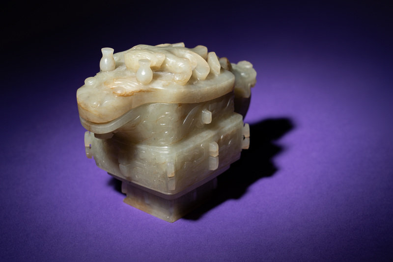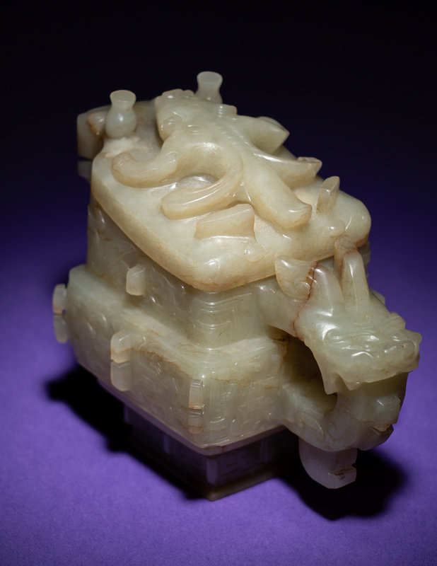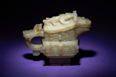 the pouring vessel is carved in shallow relief to the body. The vessel is set on one end with a loop handle emerging from the head of a mythical beast. The fitted cover is modeled as a beast. The stone is of a pale celadon tone with russet inclusions.
