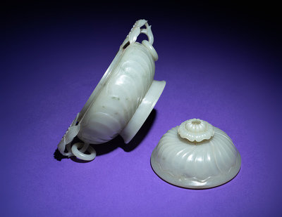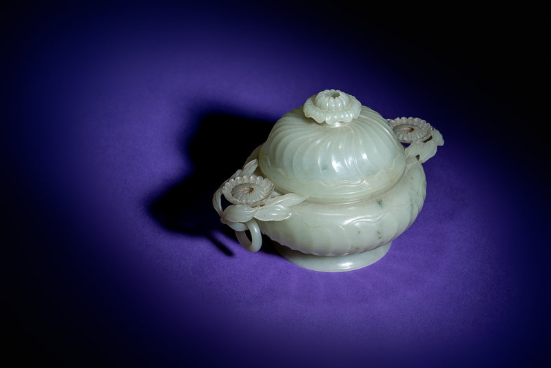 the compressed body carved with a circle of large petals, a pair of high relief-carved chrysanthemum-form handles flanking the mouth rim, suspending loose rings, the domed cover decorated with similar petal motif and surmounted by a finial in the shape of a blossoming chrysanthemum.