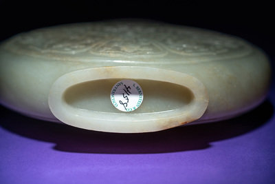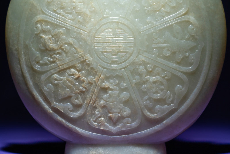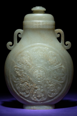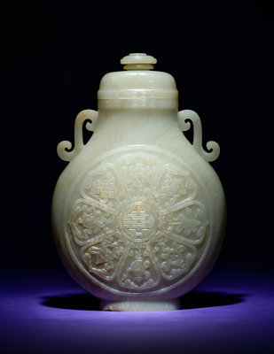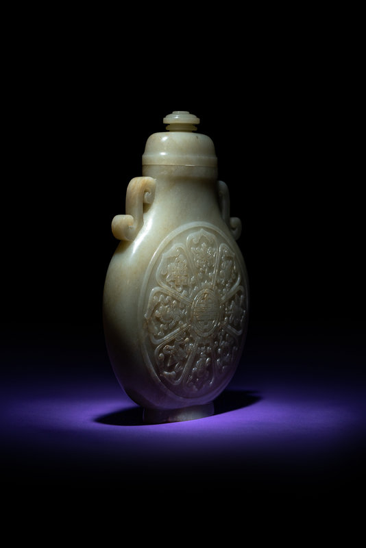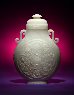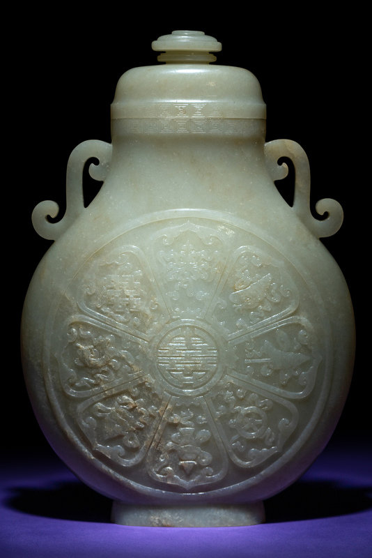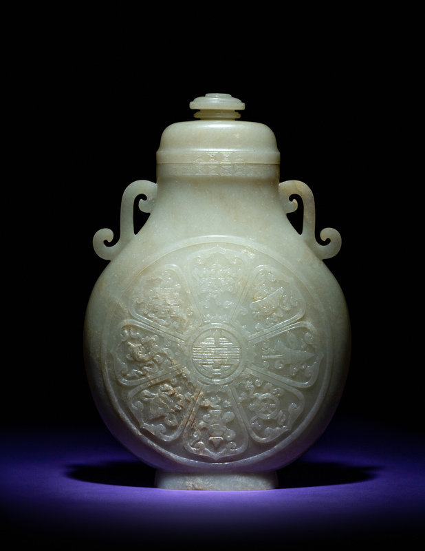 exquisitely carved in relief to each side of the flattened vase with eight petals enclosing the bajixiang radiating from a central shou medallion, the waisted neck flanked by a pair of s-shaped handles, the domed cover surmounted by a knop finial in the form of a floral blossom, the stone of a well-polished even white tone.