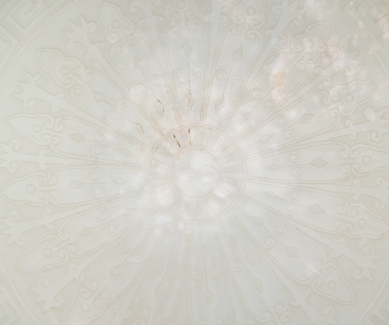 the flattened body carved on both sides, each centered with a Yin and Yang symbol, enclosed by a row of radiating spades terminating in larger ruyi heads, bordered by a keyfret band, the cylindrical neck flanked by a pair of scepter-shaped handles.