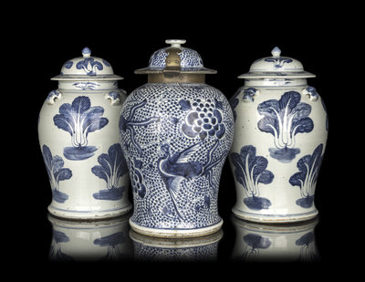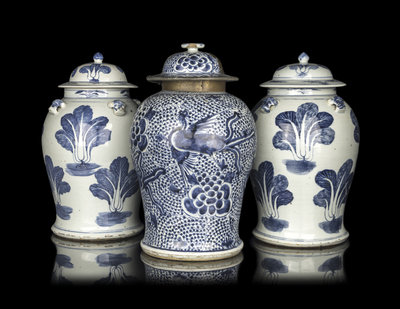 A Pair of Chinese Blue and White Porcelain Covered Jars