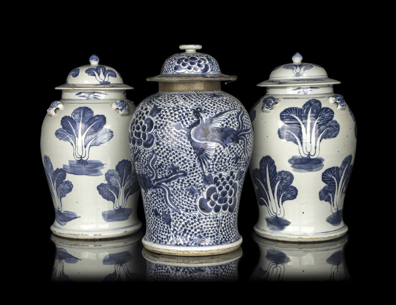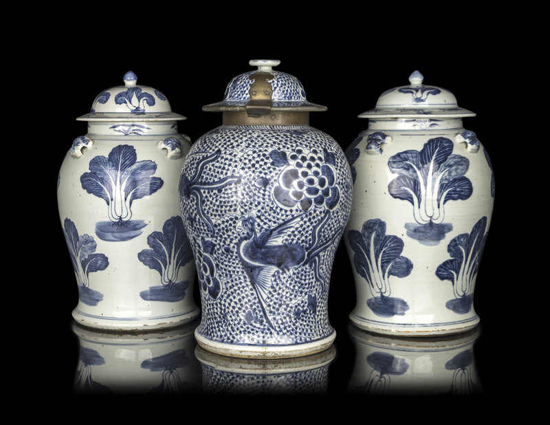 the first a pair of examples painted with cabbage leaves, the second an individual example decorated with floral blossoms.
