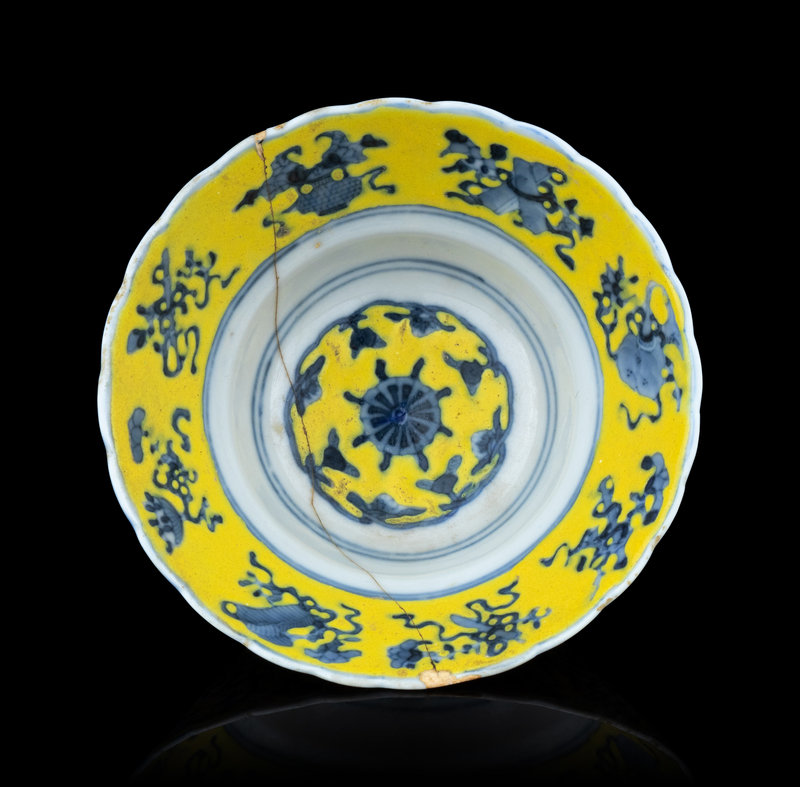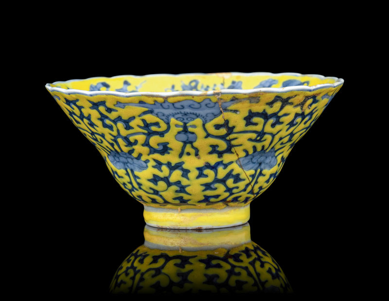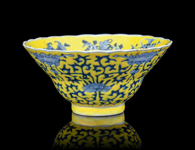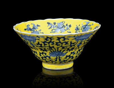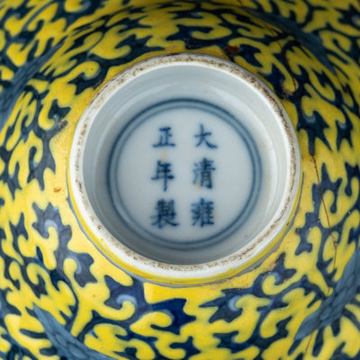 the bowl covered overall in a bright yellow glaze, decorated with ribbon-tied Daoist emblems in underglaze blue to the interior, lotus scrolls to the exterior, bearing an apocryphal Yongzheng six-character mark in underglaze blue to the underside.