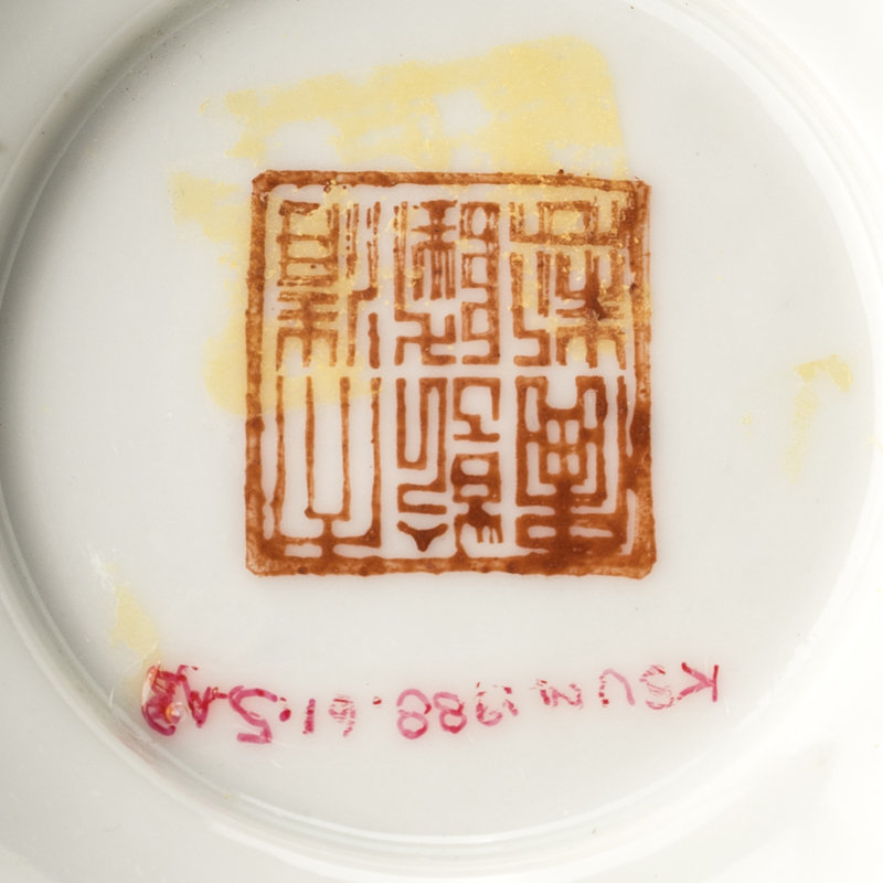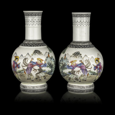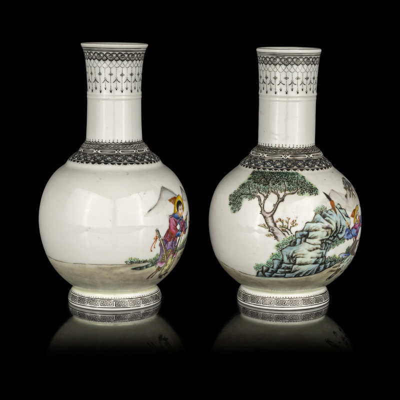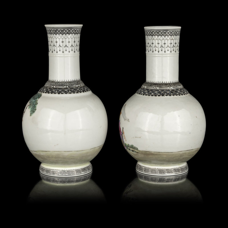 each globular body rising to a tall, cylindrical neck, painted to the exterior with two figures and a horse in a mountainous landscape, the underside bearing an iron red Qianlong six-character mark within a square panel.