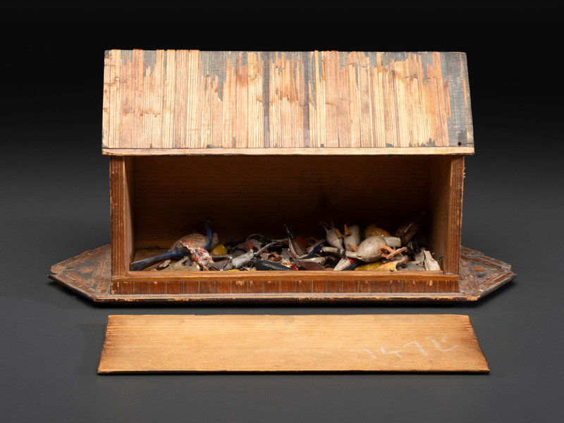 A Carved Wood and Applied Straw Work Noah's Ark with Slide-Front Cover
