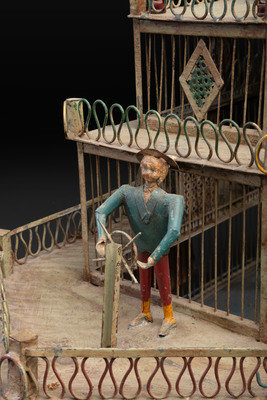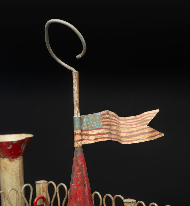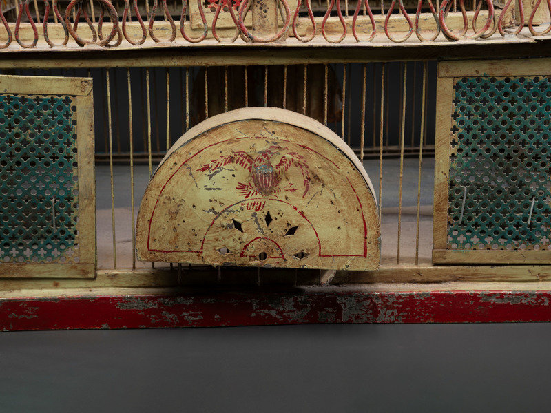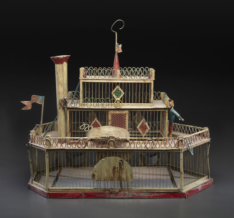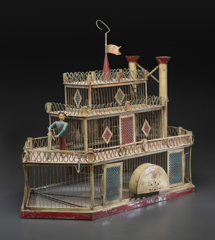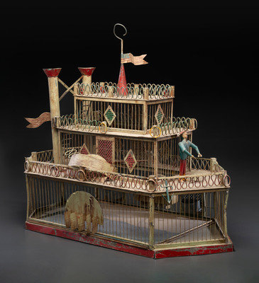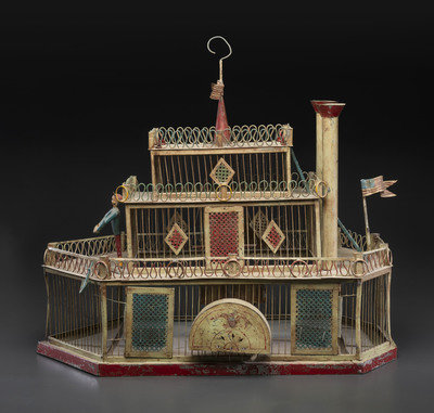 A Painted Sheet Metal and Wire Steamboat Form Birdcage