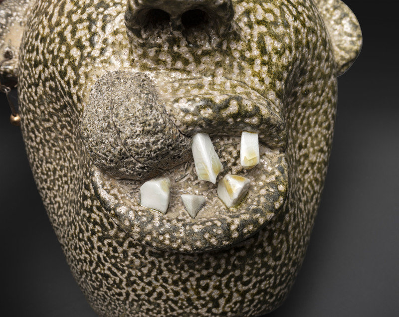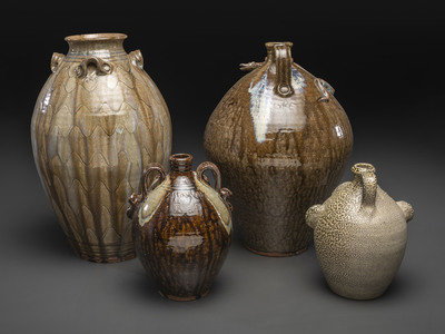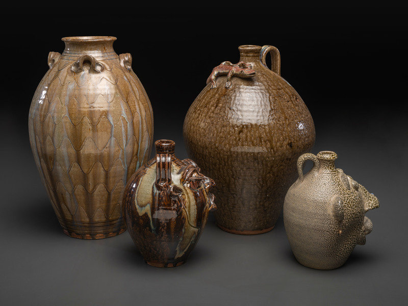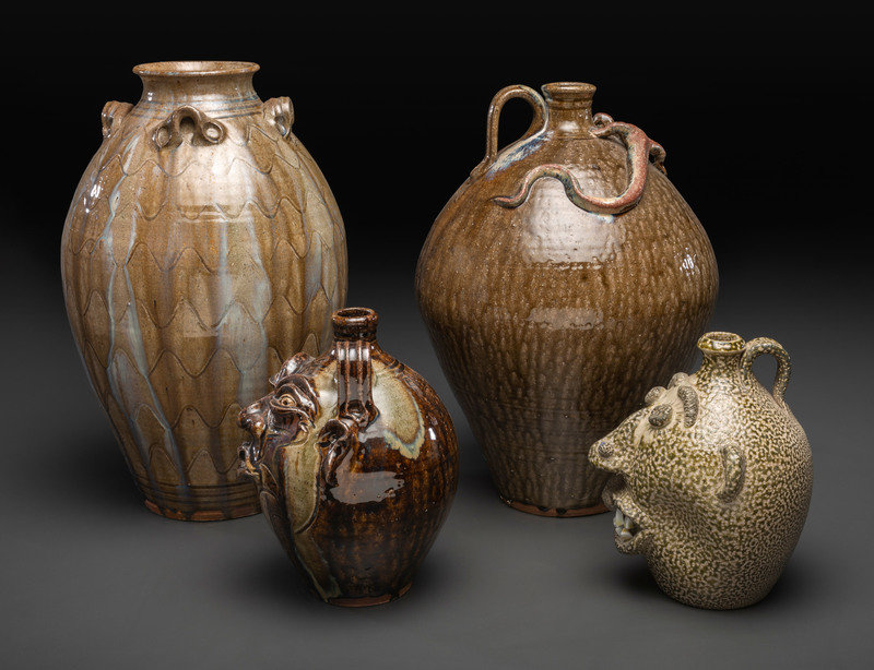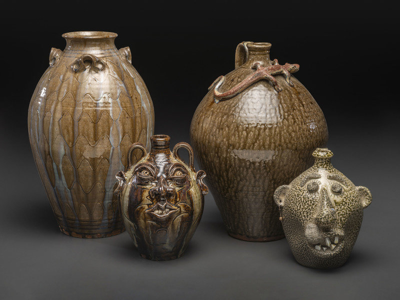 including three alkaline glaze jugs by Kim Ellington and a face jug by David Garner of Turn and Burn Pottery.