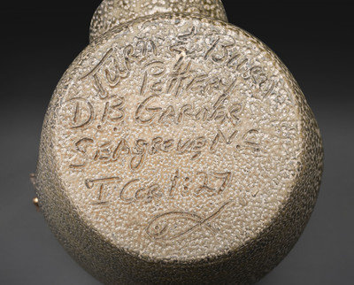 Garner jug incised Turn & Burn Pottery Seagrove, NC D.B. Garner, I Cor 1:27, underside.