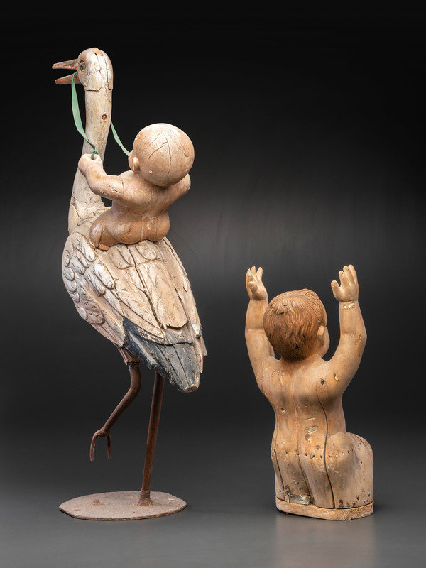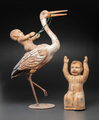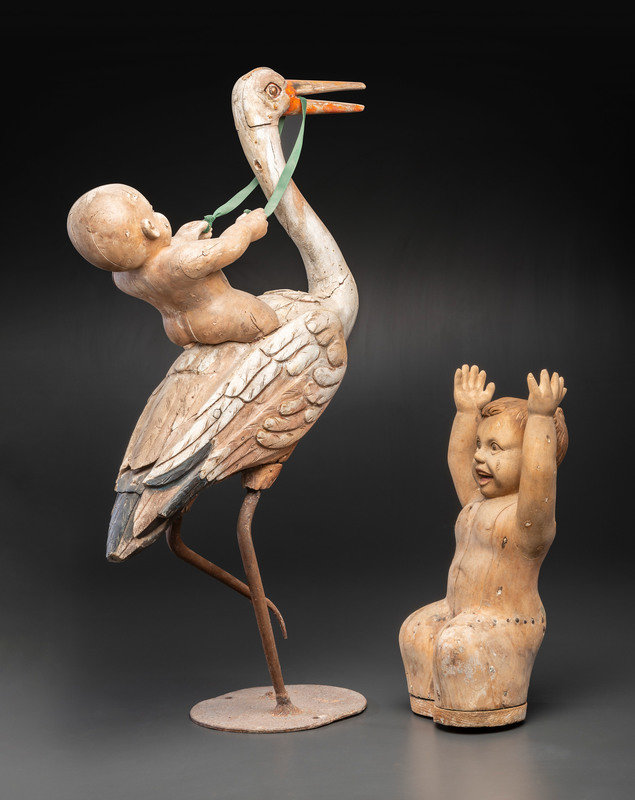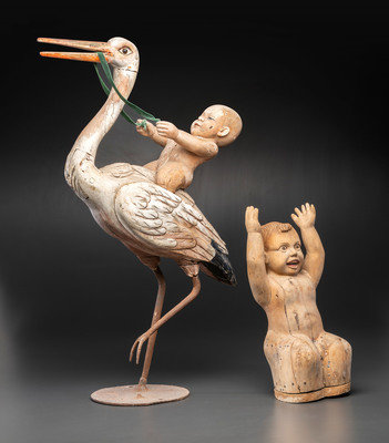 A Folk Art Carved and Painted Wood Figural Group of a Stork and Two Babies