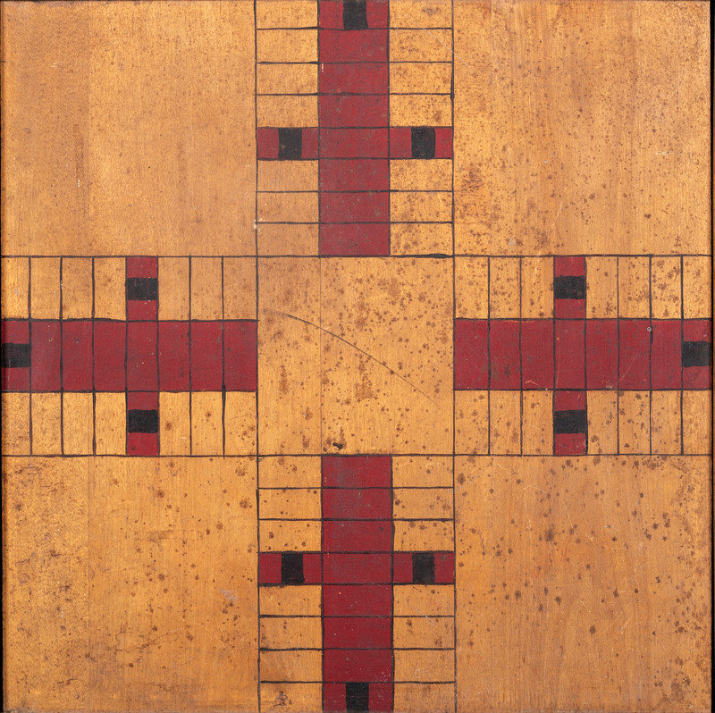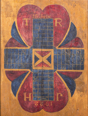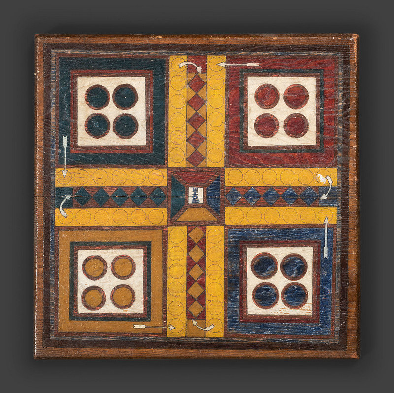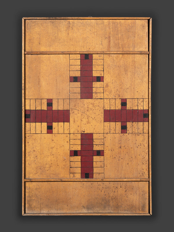 comprising one single-sided Parcheesi gameboard, one single-sided gameboard dated 1922 and initialed JH / TR, and one double-sided three-board example with applied frame and dividers.