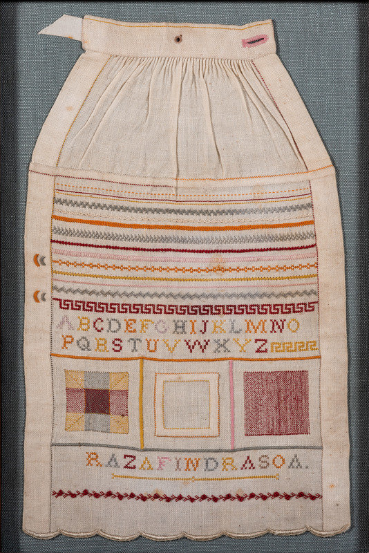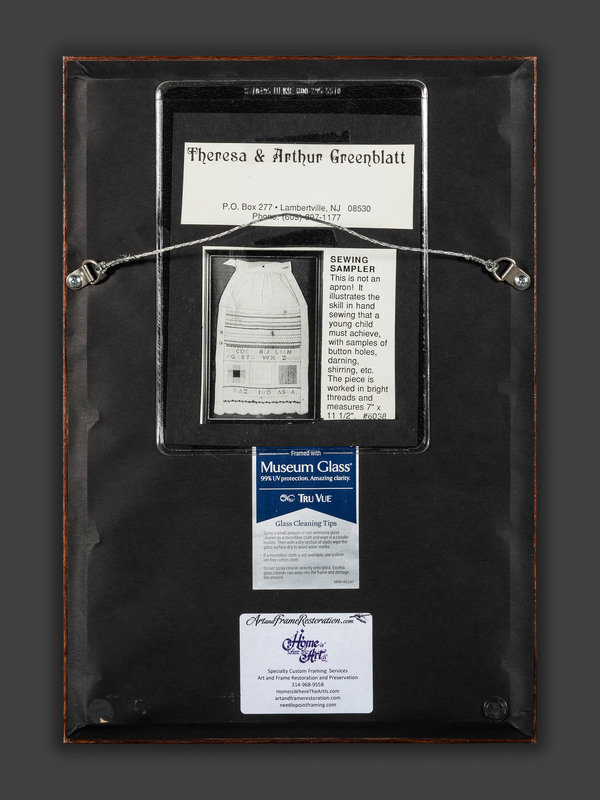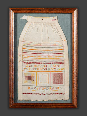 apron with alphabet lines and rows of stitched geometric patterns, with examples of darning, shirring, and buttonholes.