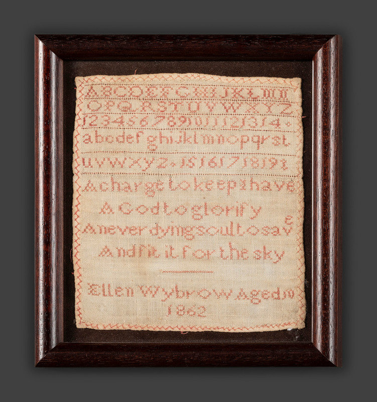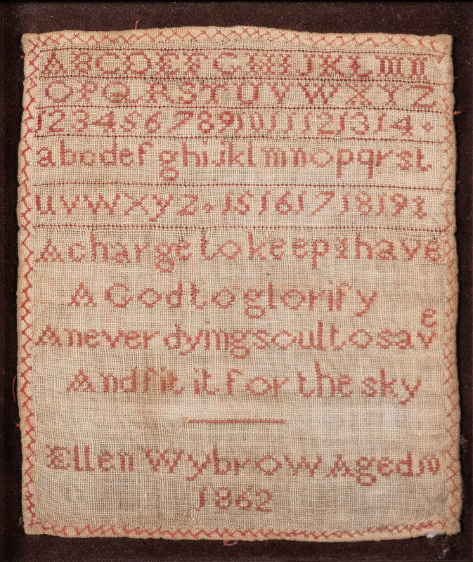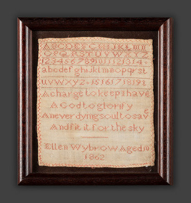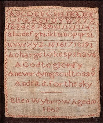 one sampler wrought by Ellen Wybrow Aged 10 / 1862 with verse from the hymn "A Charge to Keep I Have."