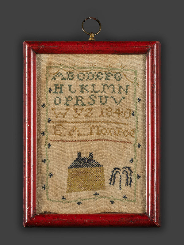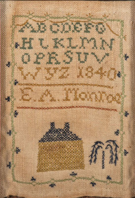 second sampler wrought by E.A. Monroe / 1840 with stitched house and tree motifs beneath alphabet lines.