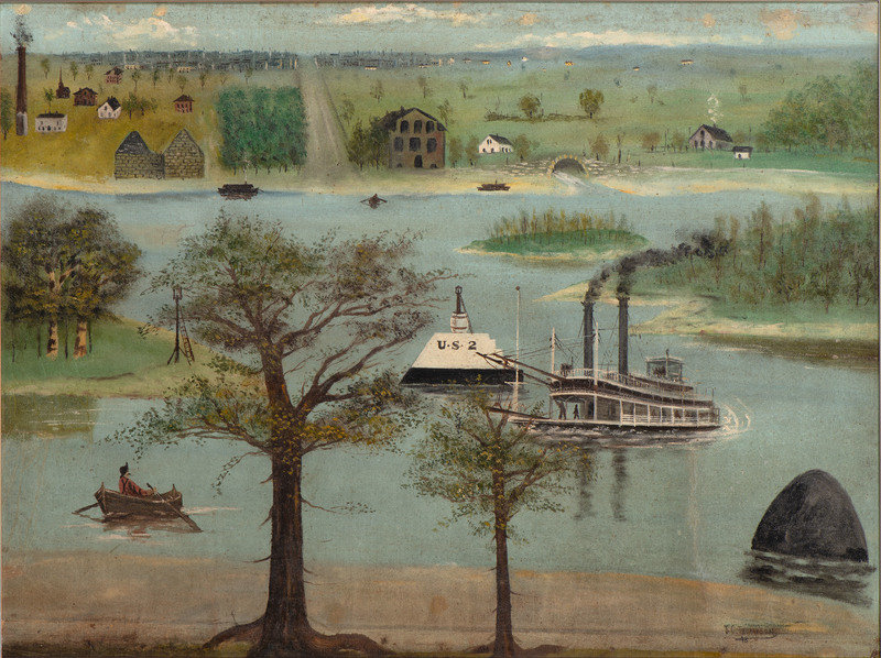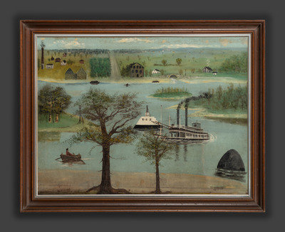 In 1839, Mormons settled in this part of Illinois, which their leader and prophet, Joseph Smith (1805-1844), renamed the Nauvoo, the Hebrew word for “Beautiful Place.” The settlement subsequently grew as a Mormon community of as many as 20,000 residents, and a commensurate building boom, of both residential and commercial structures, took place during the 1840s. One of the preexisting homes in the community, a two-story log cabin, became the residence of Joseph Smith and his family, and a similar homestead is visible in the painting offered here in the upper right corner. Also of iconographical interest is the large building at center, likely representative of Nauvoo House, a boarding house built by Smith in the 1840s to lodge Mormons who came to the area on pilgrimage.