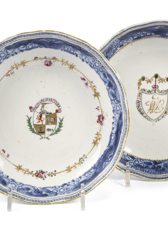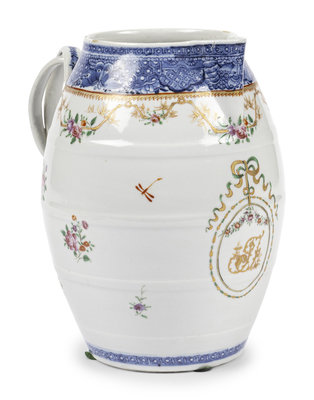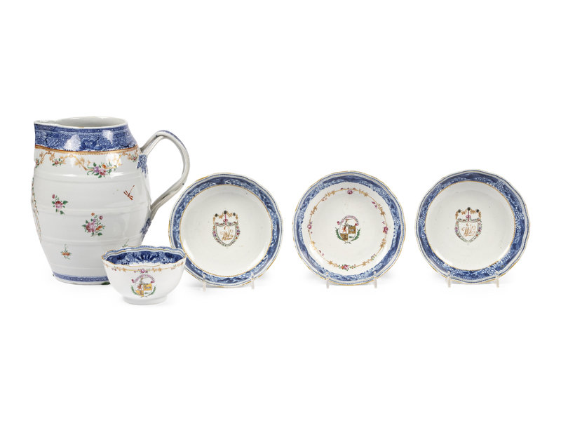 comprising a cider jug, a tea bowl with saucer and a pair of plates, all with similar famille rose and monogram or crest decoration.