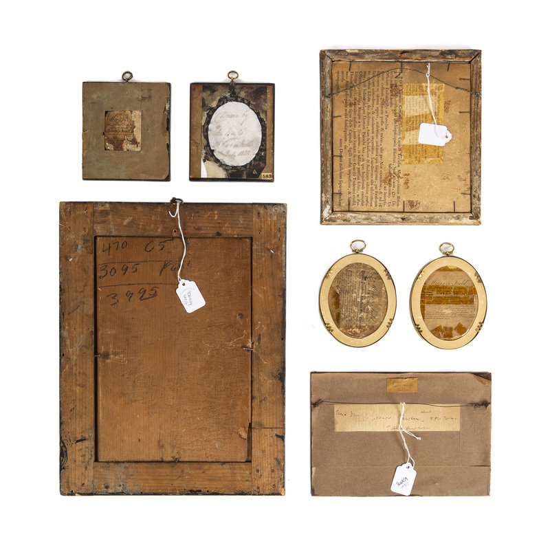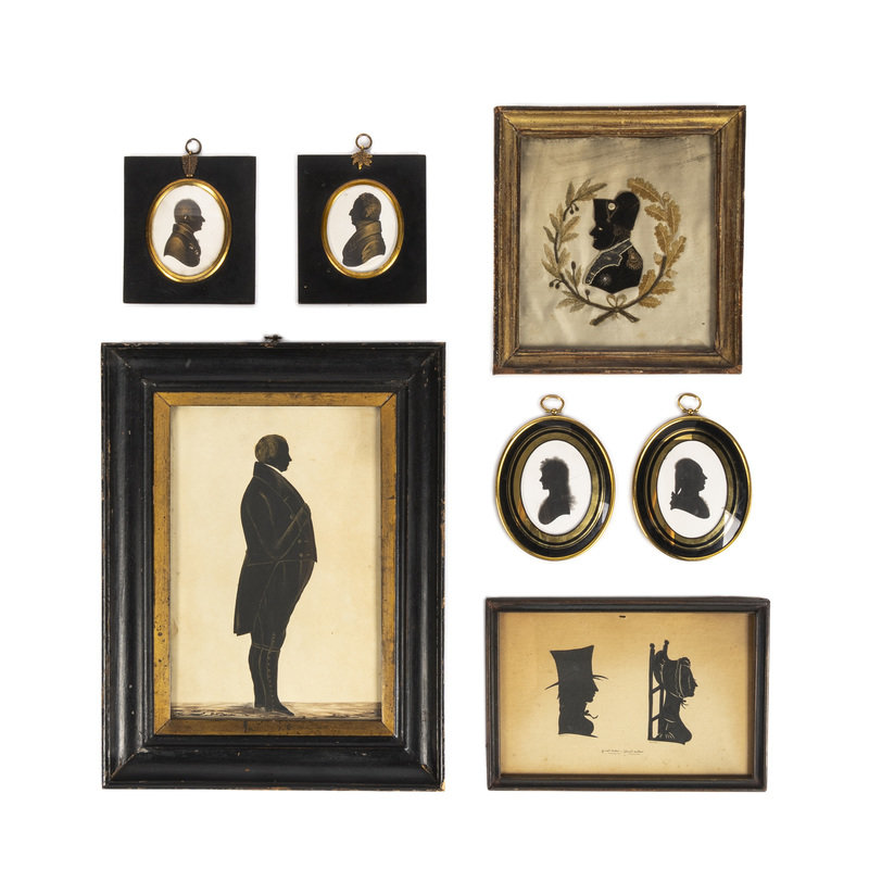 including an embroidered example and one example comprising two portrait silhouettes in a single frame; 7 frames total.