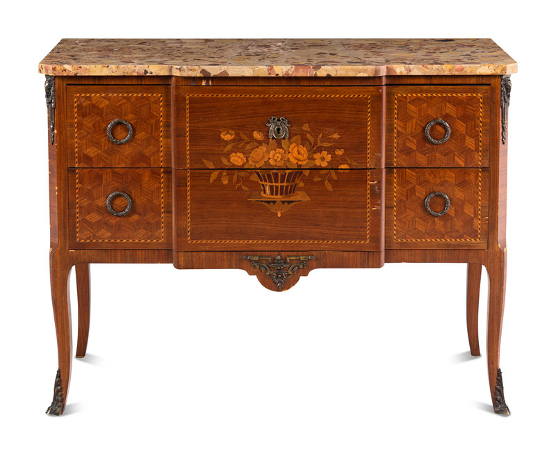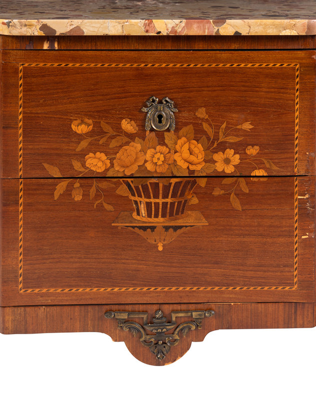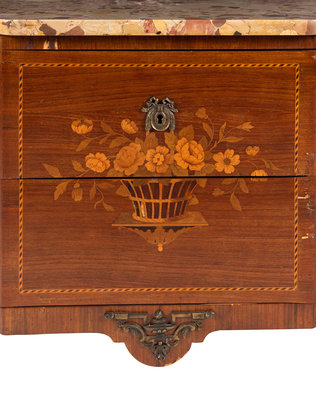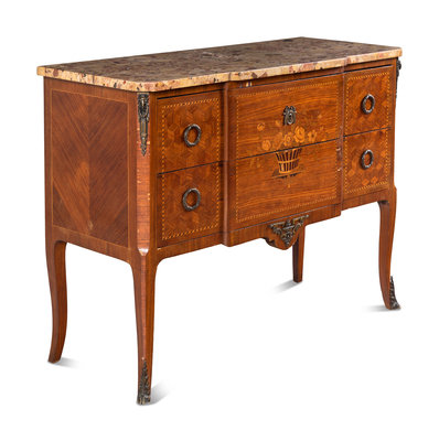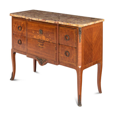 A Louis XV/XVI Transitional Style Marquetry Marble-Top Commode