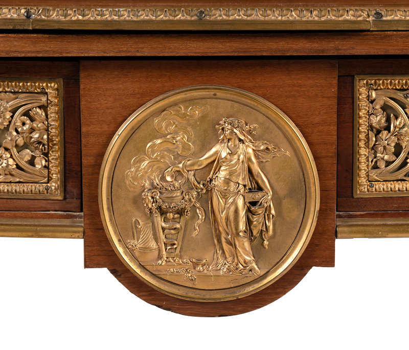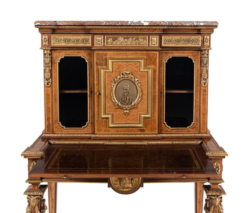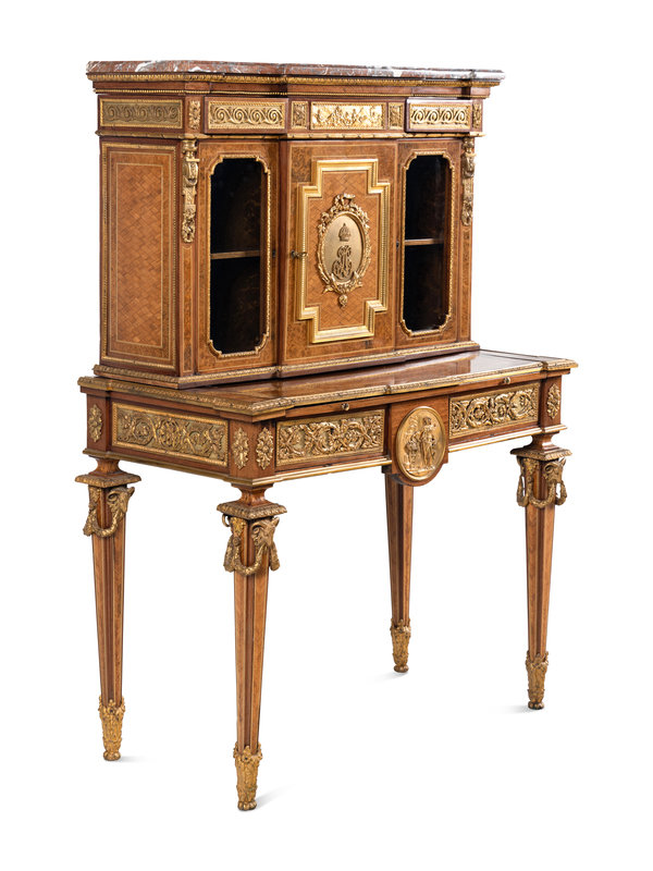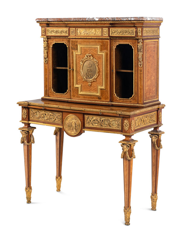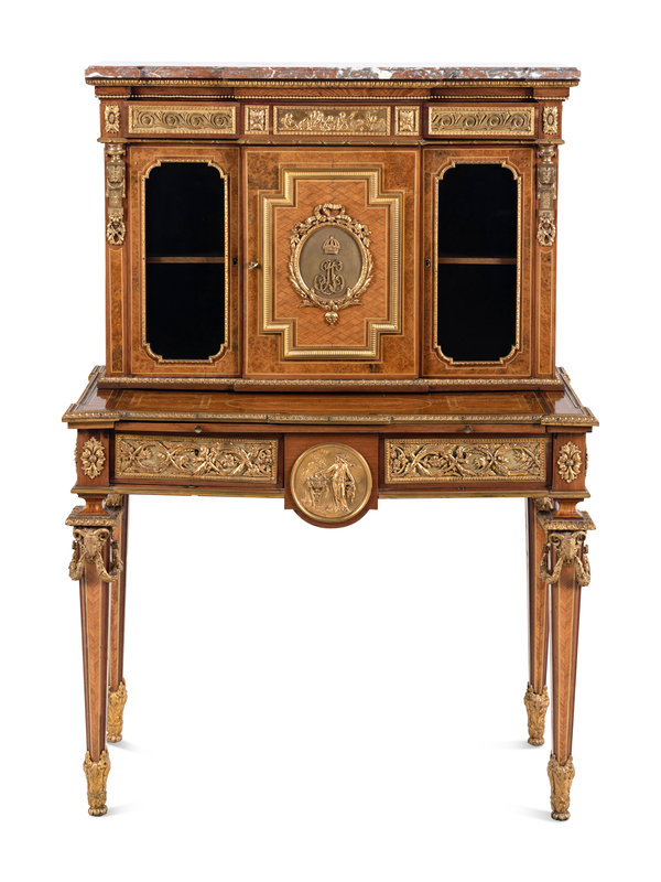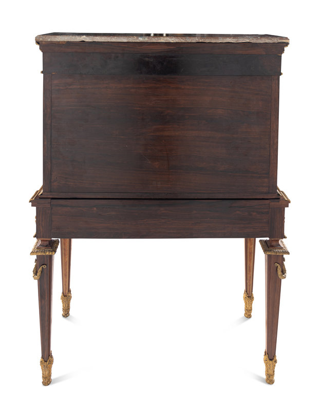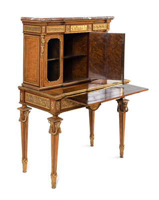 A Louis XVI Style Gilt Bronze Mounted Amaranth, Burr Maple and Kingwood Parquetry Marble-Top Bonheur du Jour