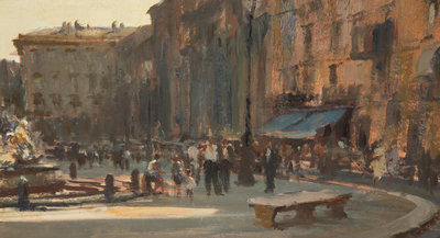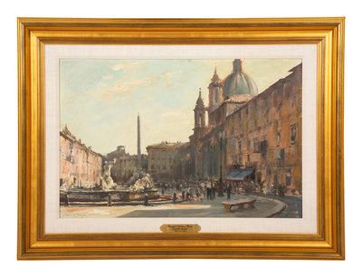 signed Edward Seago (lower left); inscribed Piazza Navona, Rome (on the reverse)