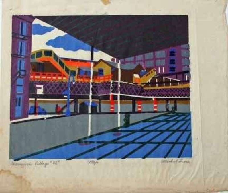 MICHAEL LEONE (AMERICAN 20TH C.)THREE COLOR LINOLEUM CUTS GREENWICH VILLAGE "EL"