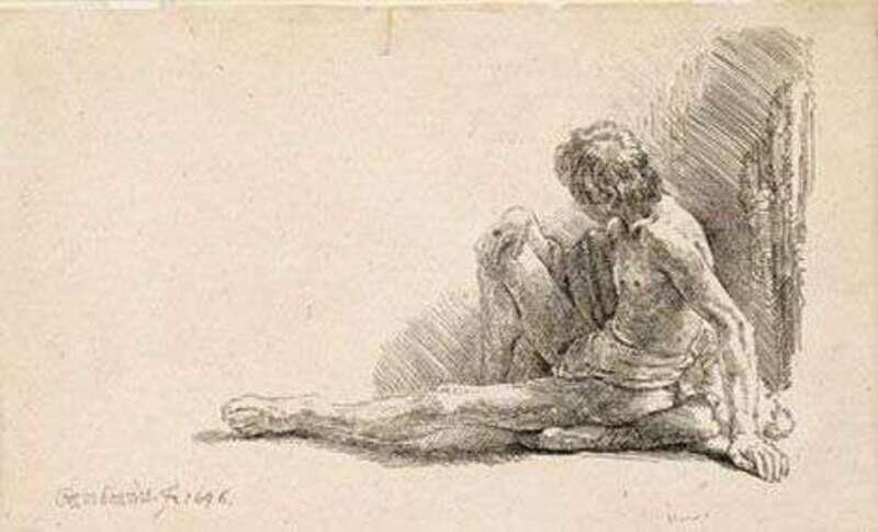 REMBRANDT HARMENSZ VAN RIJN (DUTCH 1606-1669) NUDE MAN SEATED ON THE GROUND WITH ONE LEG EXTENDED