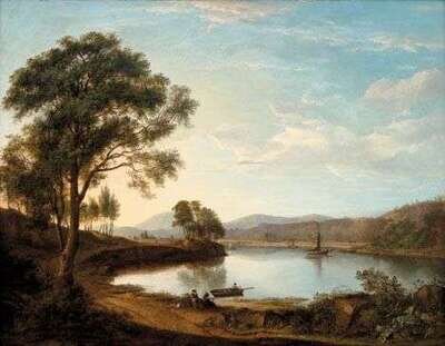 FOLLOWER OF ALEXANDER NASMYTH (BRITISH 1758-1840) TRAVELLERS ON A ROADSIDE BY A RIVER, A FIGURE IN A PUNT IN THE FOREGROUND
