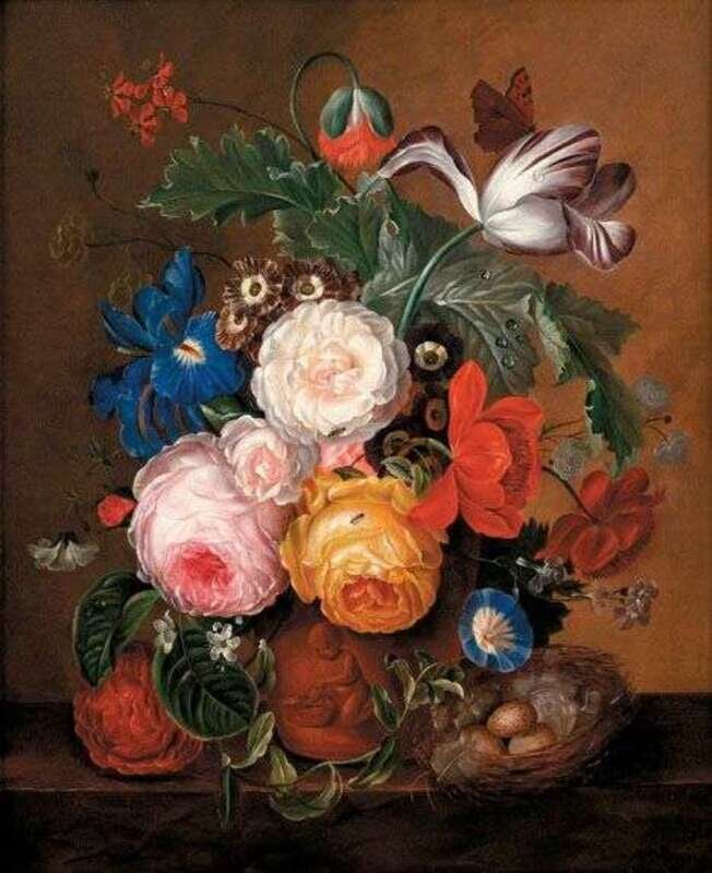 ATTRIBUTED TO ADRIANA JOHANNA HAANEN (DUTCH 1814-1895) ROSES AND MIXED FLOWERS ON A LEDGE WITH BUTTERFLY, BIRD'S NEST AND INSECTS